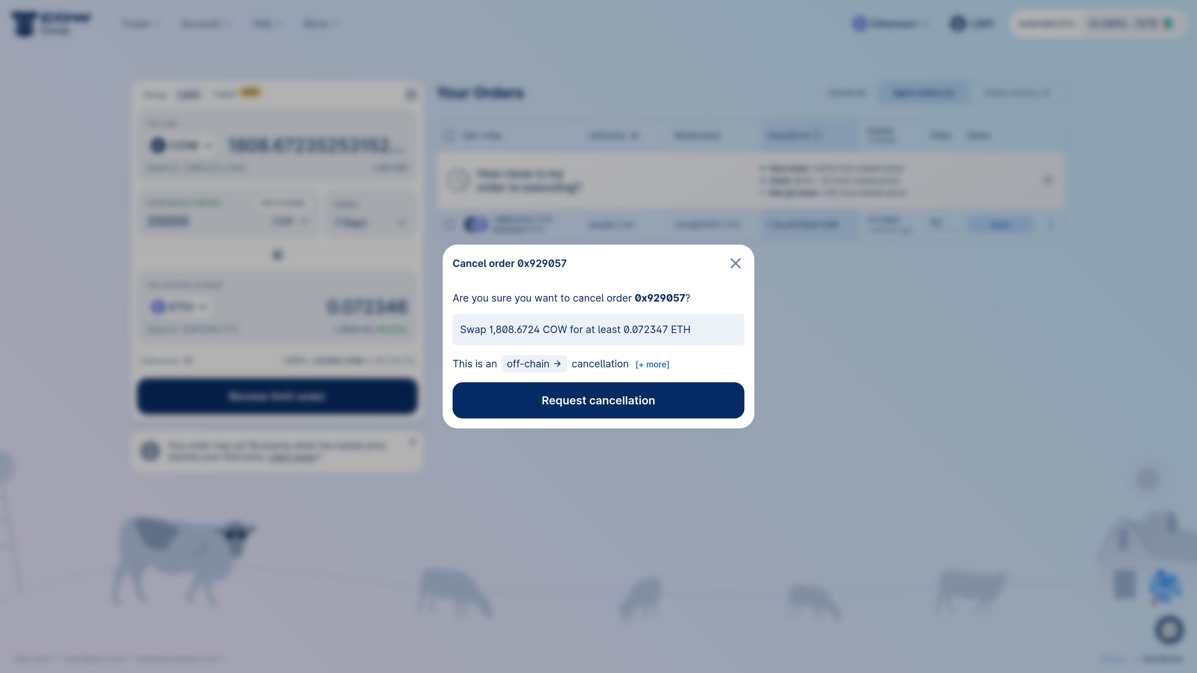 Now we've been doing some thinking and realised we shouldn't be selling COW, so we want to cancel our limit order. We can do this by clicking the context menu on the order and selecting "Cancel order":